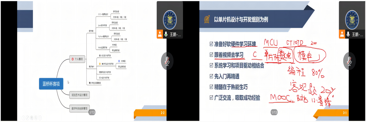 王鹏老师首先从参与竞赛是提高自身综合素质的重要手段,竞赛获奖是科研潜力的有力证明,竞赛获奖是用人单位评估人才的重要依据,讲述了理工科大学生参加学科竞赛的必要性。其次分析了蓝桥杯比赛的分类与特点说明了为什么蓝桥杯比赛是最为适合低年级的新生与从来没有参加过学科竞赛的“小白”参加的比赛,鼓励同学们积极报名参加。最后,他以电气信息工程学院学生最适宜参加的单片机设计与开发组别为例,总结了准备好软硬件学习环境、跟着视频去学习、系统学习和项目驱动相结合等六步参赛经验,并告诉同学如何准备参赛。